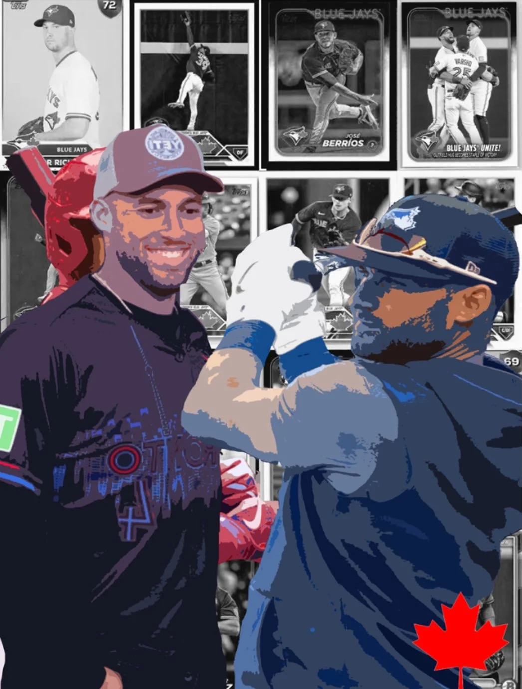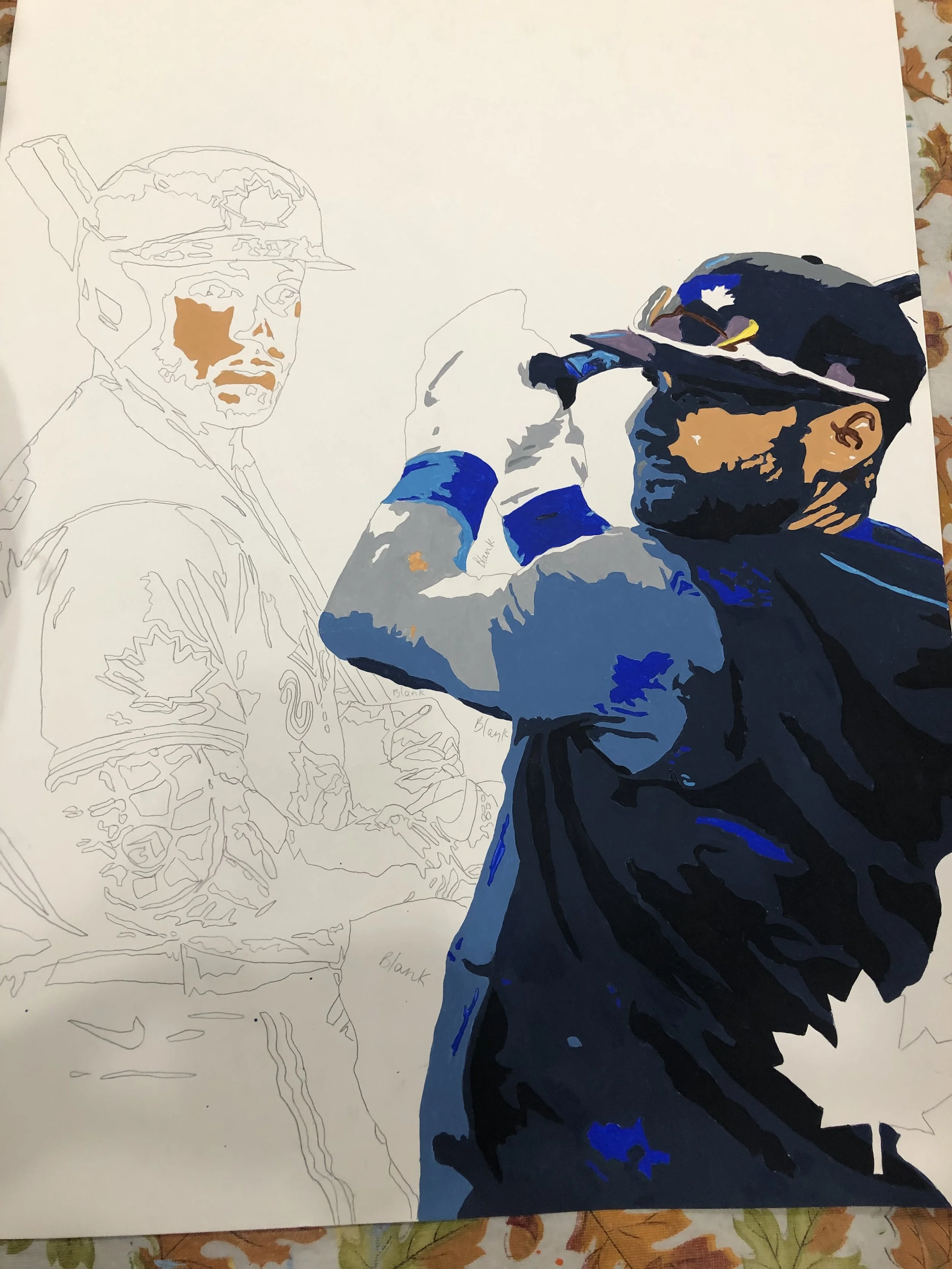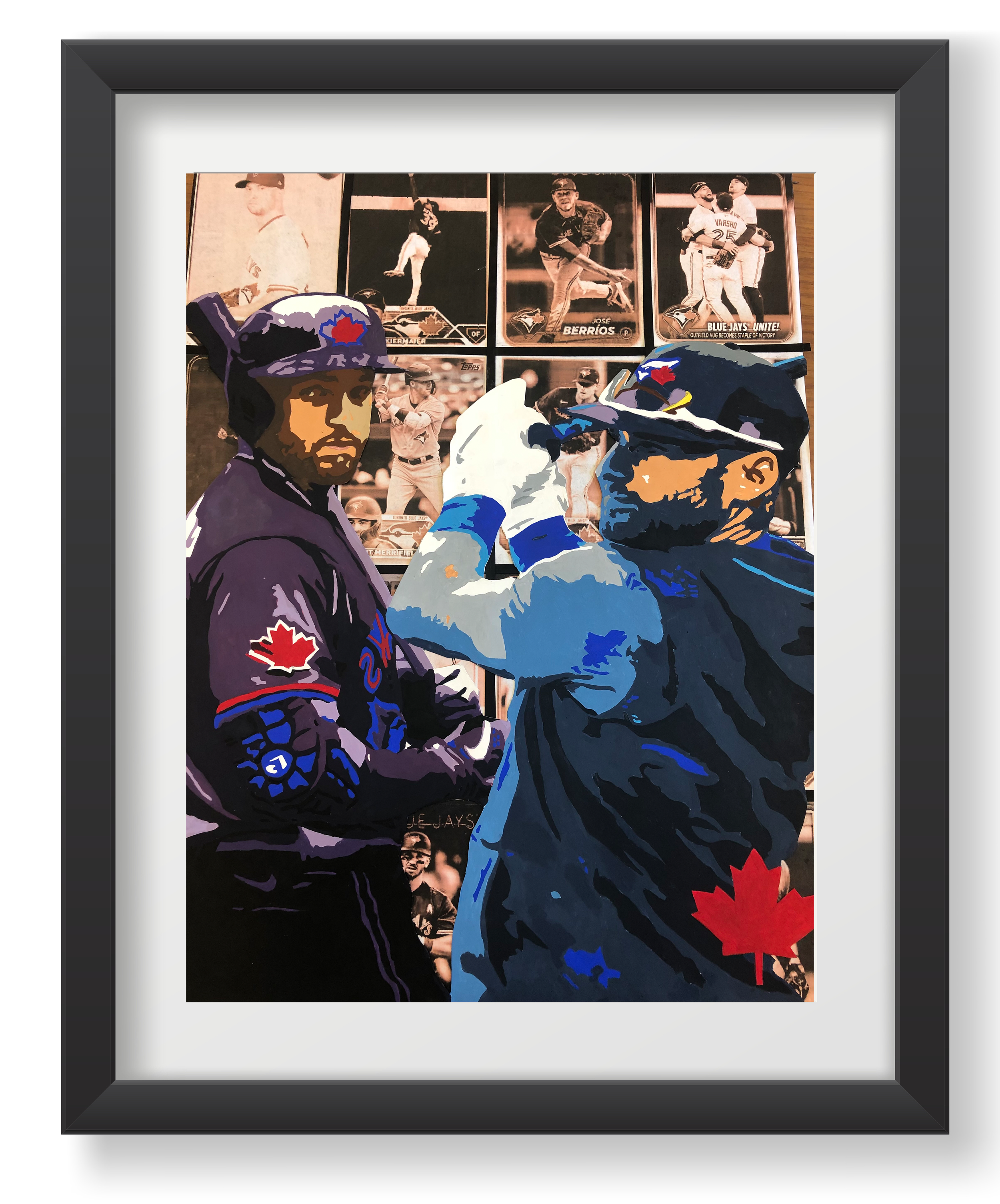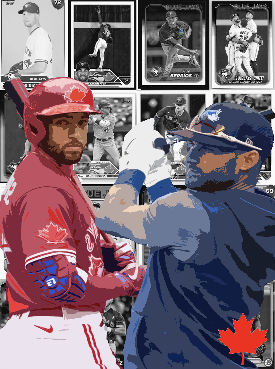 This is an acrylic painting of Kevin Kiermaier and George Springer, with black and white, baseball card-style images of other Toronto Blue Jays players layered into the background. I wanted to focus on two key players while still including the rest of the team, using colour vs. black and white to create contrast and draw attention.