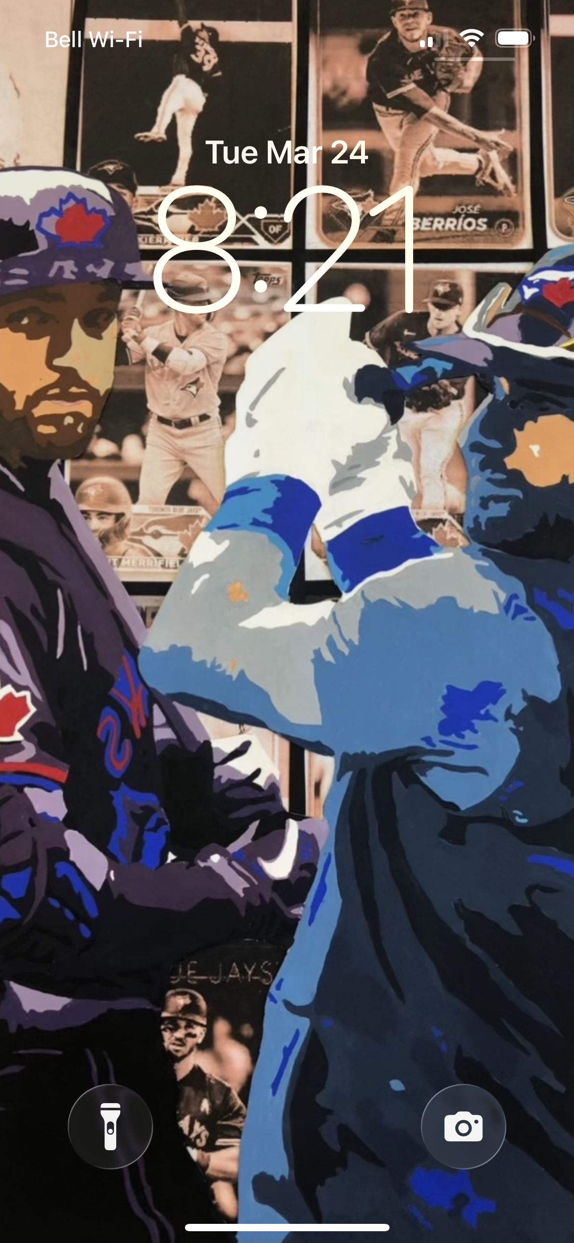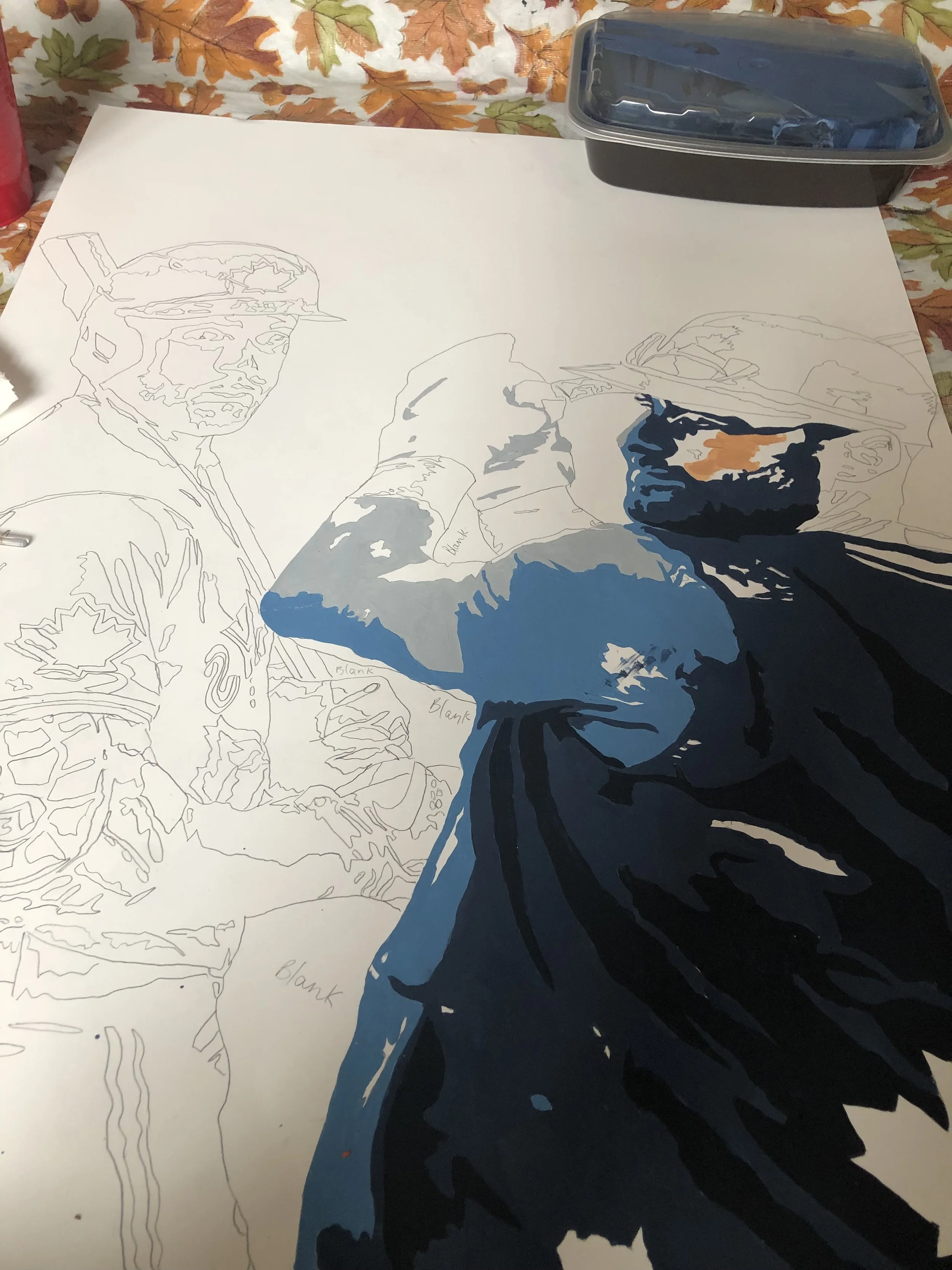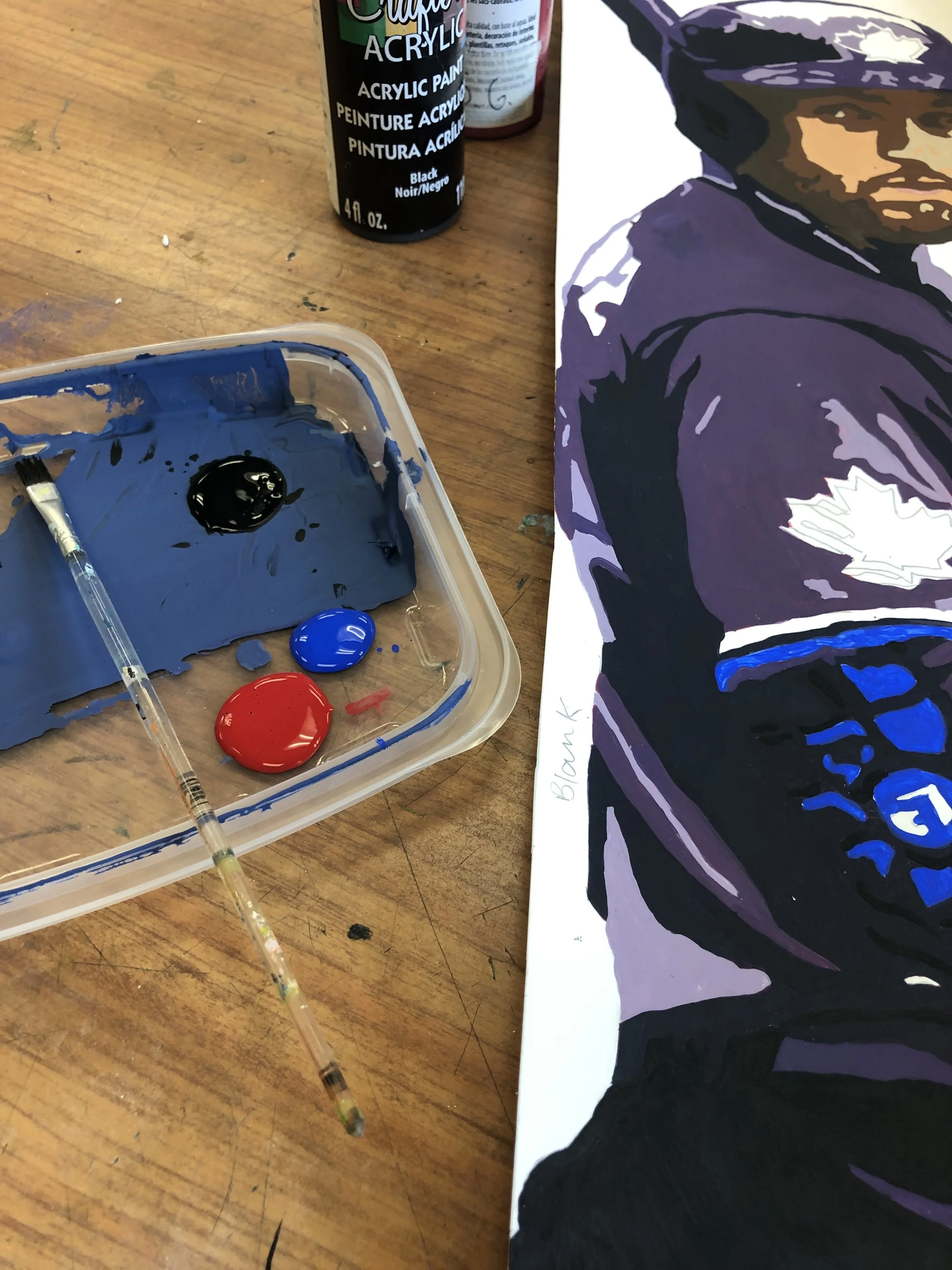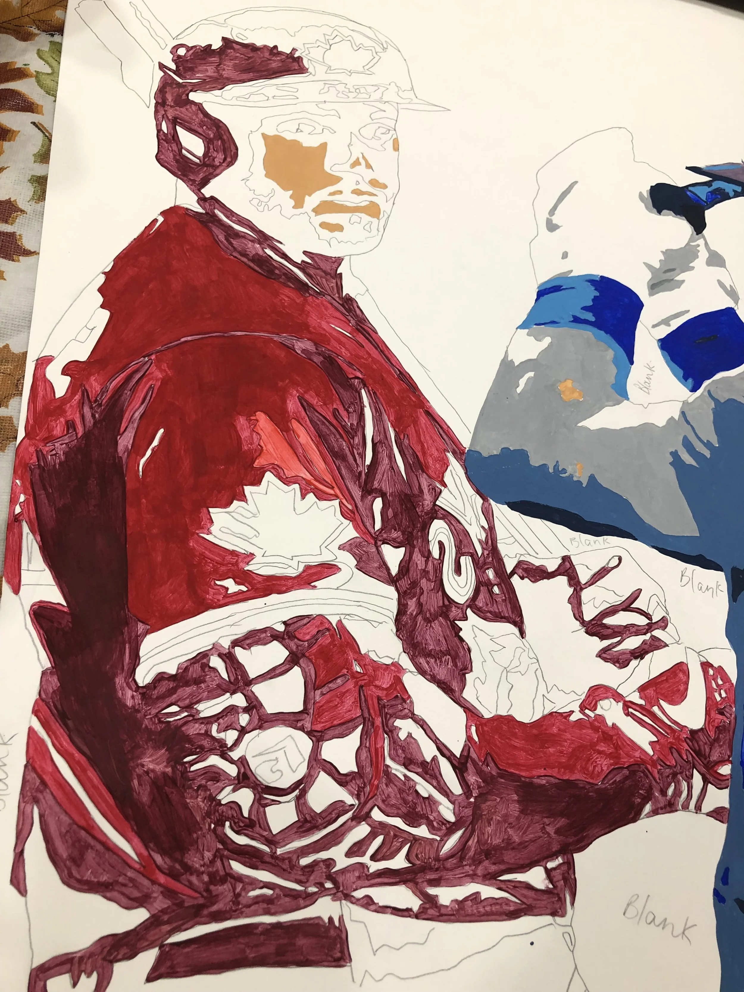 This is an acrylic painting of Kevin Kiermaier and George Springer, with black and white, baseball card-style images of other Toronto Blue Jays players layered into the background. I wanted to focus on two key players while still including the rest of the team, using colour vs. black and white to create contrast and draw attention.